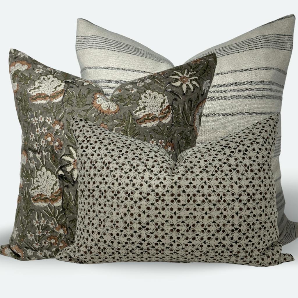 3 piece set includes 22x22 Brown Woven Stripe, 20x20 Heirloom Block Print, 14x20 Slate Grey Dot (Please note: inserts are not included.)